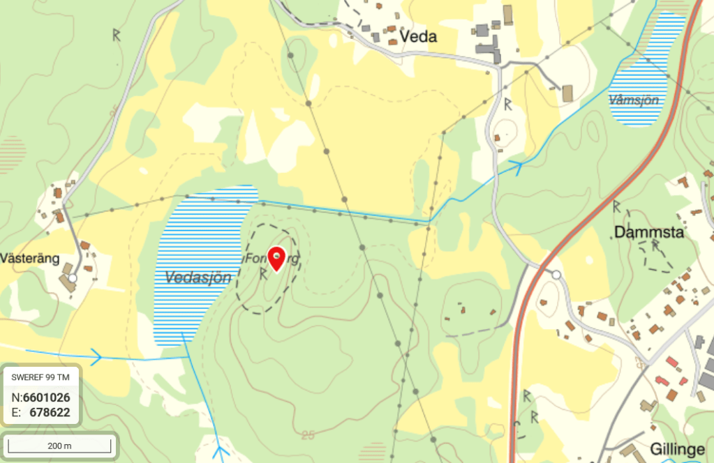 Besök: Det går att parkera till vänster strax efter infart Västeräng Veda på början av en väg man sen kan följa till den stora kraftledningen som man kan gå efter till dess att man ser borgberget. Busshållplats Angarns-Veda ligger på Gamla Norrtäljevägen mindre än 100 meter från Västeräng Veda avfarten. Besökt i januari 2024.