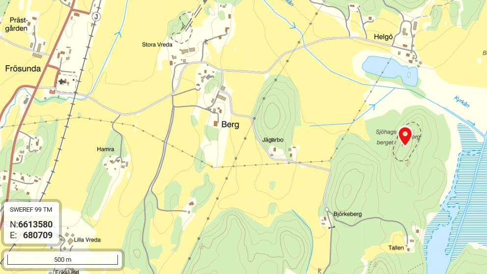Besök: Jag parkerade på liten körväg som gick från nittigraderssvängen innan torpet Björkeberg (se karta ovan). Enklaste väg är nog att runda det första berget så syns borgbergets branta sida. Jag gick upp från söder då terrängen verkade lättare där. Det finns busshållplats vid Frösunda kyrka på drygt 2 km avstånd från borgen. Besökt i januari 2024.