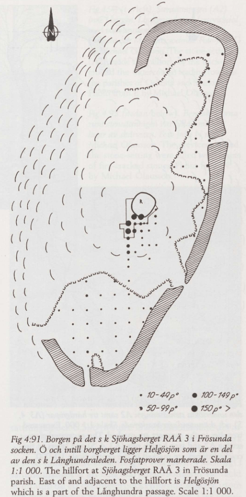 Borgberget är ovalt och tämligen symmetriskt med en platå uppepå. Berget är som brantast med stup åt väster, där saknas mur. Borgstorlek 80×110 meter. Det finns en sammanhängande vall mot norr, öster och söder som är cirka 140 m lång, som mest 1,2 meter hög och som bredast 4 meter. Den är till stor del rasad men bitvis ses kallmurning. Två ingångar finns: i nordost och i söder. Mitt uppe på borgens högsta parti som är som en platå med släta hällar finns en finns en stensättning (Frösunda 3:2) som enligt Olausson 1995 är från sen bronsålder. Efter användningen av platsen under bronsåldern har det gått många hundra år innan fornborgsmuren byggts och till stor del förstörts någon gång mellan romersk järnålder och folkvandringstid (Olausson 1995:23).