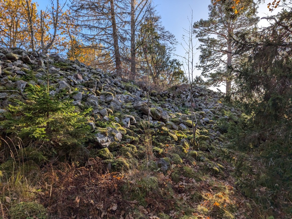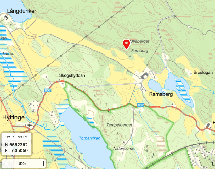 Besök: Cirka 950 meter nordväst om Hyltinge kyrka på väg 857 tag vänster mot Ramsberg (avtagsvägen är inte skyltad). Jag parkerade efter de enorma ekonomibyggnaderna och följde åkerkanter till borgberget en knapp km. Rekommenderar ingången i norr. Det är mycket brant på bergets östsida och mycket rasade stenar. Besökt i oktober 2024.