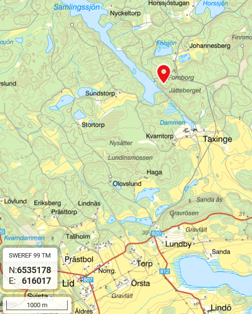 Besök: Från väg 820 vid Lundby tag av mot Taxinge säteri 2. Passera Taxinge, efter cirka 1,4 km finns plats parkera vid början av bommad väg åt vänster. Följ vägen 250 meter sen ligger borgen in till vänster. Fin skog. Besökt i september 2024.