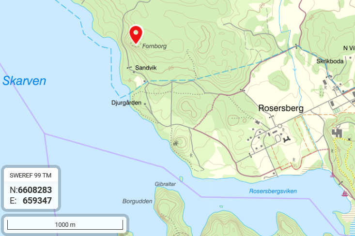 Besök: Nära Rosersbergs slott. Rosersberg är skyltat från E4 norr om Upplands Väsby. Vid Rosersbergs slott finns en stor gratisparkering. Från den är det cirka 1,7 km gångväg till berget (skyltar med skyddad fornlämning eller liknande text finns vid borgbergets fot). Berget ligger på militärt övningsområde, kontrollera på försvarsmaktens hemsida eller följ skyltning på plats om/när tillträde ej är möjligt. Busshållplats Räddningsverket ligger 800 meter från Slottsparkeringen. Besökt i maj 2024.