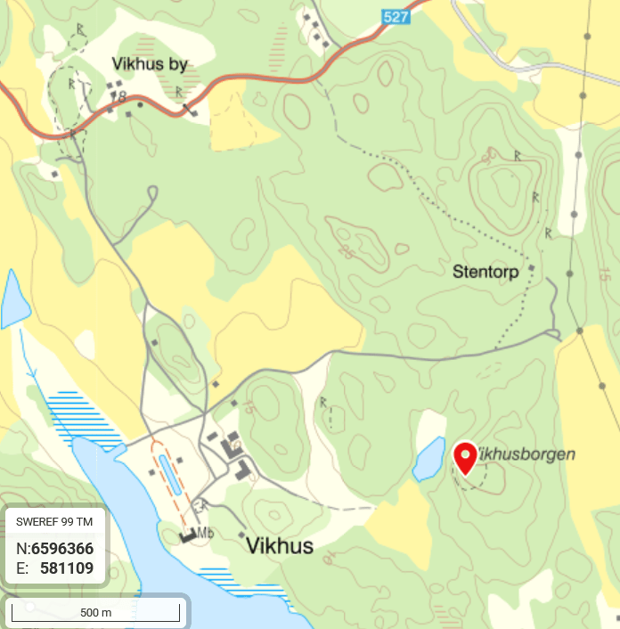 Besök: Från E18 i Västerås ta av mot Hamnen, sen Tidövägen. Avtagsvägen till Vikhus är inte skyltad annat än med förbud för motortrafikskylt och ”här slutar allmän väg”. Det ser ut som att man kan parkera vid väg 527 mot Rytterne kyrka cirka 350 meter öster om Vikhusavfarten. Gångväg till borgen då 2,5-3 km, det mesta på väg. Det är svårframkomlig terräng kring borgen utom från nordnordost (nästan från den lilla vägens vändplan). Kompass kan vara bra att ha. Liten stig vid borgen leder ner mot stängslad hagmark i öster och slyiga områden norrut och samma väg tillbaka kan vara att föredra. Busshållplats Vikhus cirka 2 km från borgen. Besökt i september 2024.