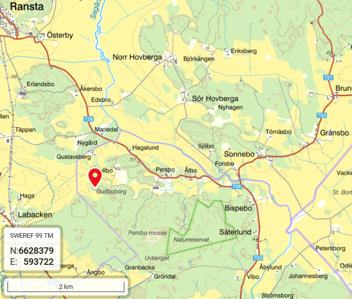 Besök: Gullbo är skyltat från väg 726. Det är en smal väg och skylten med enskild väg står en bit in och syns inte förrän man svängt av och har svårt att vända. En möjlig parkeringsplats kan vara på väg 726 vid hage strax sydost om Gullbo avfarten. Eftersom jag redan åkt in parkerade jag vid vägen innan gården, trångt och inte optimalt. Gården har skyltar om lösspringande hundar. Vägen mot borgen går förbi gården och söderut mot skogen och passerade augusti 2024 en kohage med elstängsel. I skogen finns en liten stig mot borgen parallellt med åkern en bit upp från denna. Ingen busshållplats inom 3 km.