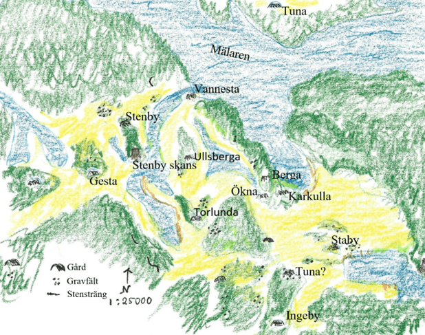 Ett stort gravfält ligger cirka 200 meter nordväst om gården, det innehåller övervägande runda stensättningar. Nuvarande Toresund sockenkyrka ligger cirka 2 km från gården. Kring kyrkan finns tre gamla gårdstomter: Ökna, Kar(le)kulla och Berga. Ökna var prästgård, Karlekulla komministerboställe. Cirka 3,6 km från Stenbygården finns på karta från år 1727 ett nu försvunnet Ingeby. I Fornsök finns det markerat som Ingeby gamla tomt (RAÄ Toresund 454). Mellan Ingeby och Ökna nära nuvarande kyrkan har det funnits ägonamn som talar för att det är platsen för ett nu försvunnet Tuna, bl.a. Ökna Tunfjell och Tunskiftet. Det finns också stora gravfält sydöst om Ökna som skulle kunna tala för tidigare bebyggelse i området (Hellberg 2013:21). Staby (Stavby) gamla tomt (RAÄ Toresund 455) ligger ytterligare cirka 500 meter sydöst. Mellan Ingeby och Stavby finns en kammargrav med rika fynd (RAÄ Toresund 37:1), det finns också lösfynd i guld i Historiska Museets samlingar. Nära Stenby ligger Torlunda och Ullsberga. Vannesta vid Mälaren bör enligt Hellberg vara ett Husa (Vatn-Husar) och tillhör ett yngre skikt administrativa namn.