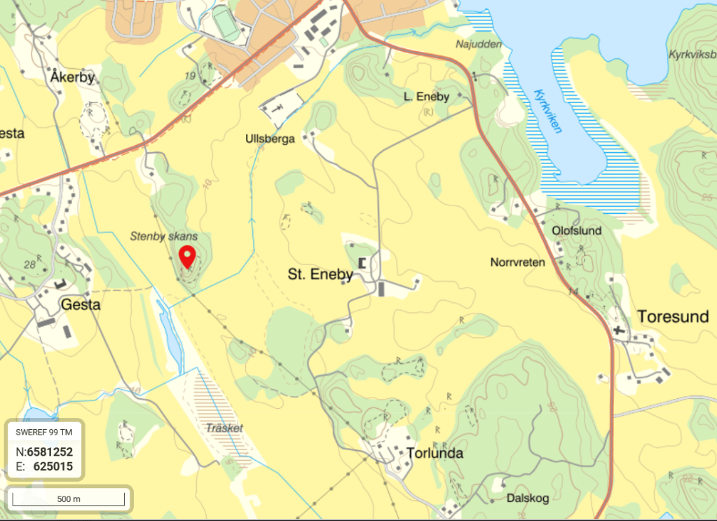 Besök: Det går att parkera på avtagsvägen norrut i höjd med Stenby och sen försiktigt korsa Strängnäsvägen och följa åsen på östsidan. Inte så brant från detta håll. Närmaste busshållplats Giresta ligger cirka 550 meter bort längs Strängnäsvägen, det finns gång/cykelväg parallellt med landsvägen. Besökt i augusti 2022.