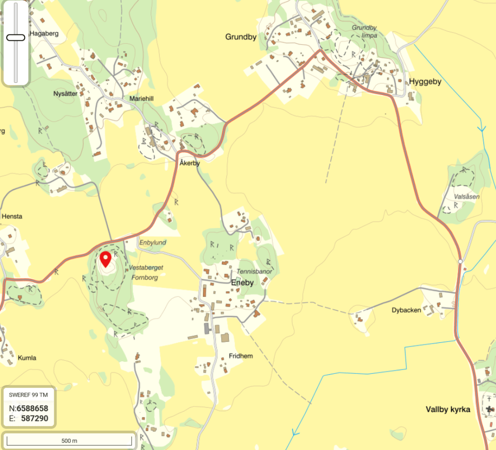 Besök: Det finns plats för några bilar vid vägkanten nedanför borgen. Närmaste busshållplats är Enebyvägen cirka 50 meter från borgen. Borg med väldiga murrester och fin utsikt. Besökt i juli 2020.